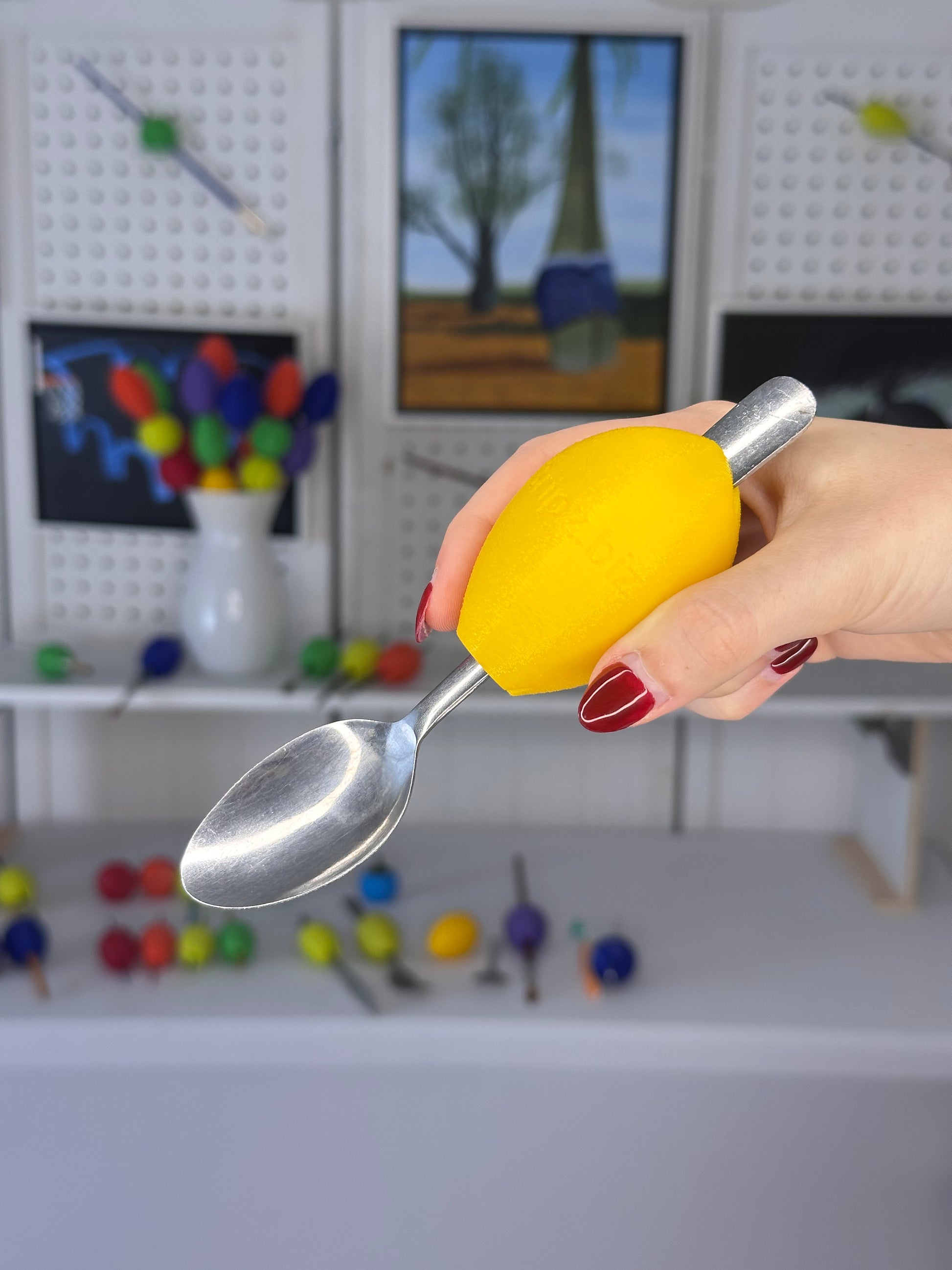 Slides over forks, spoons, and table knives, and grips where the user wants it to.